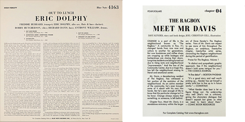 The back cover is much closer to the source material, the phenomenal Out to Lunch by Eric Dolphy. The Bodini font gets some more play here for the titles, and Futura for the body (at least that’s what I think it is). The original album has such an elegant and efficient layout, to stray too much would have been folly. Unfortunately, the eye is not drawn to the press quotes as much as it could have been, but I was willing to sacrifice marketing for design.